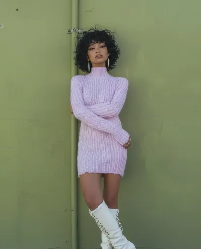 This pastel lilac sweater dress is the perfect mix of cozy and chic, with its snug fit and soft, textured knit. The high neckline and long sleeves keep it practical for winter, while the mini length adds a playful touch. The real show-stealer here? Those knee-high white boots with bold lacing details they take the outfit to a whole new level of fierce sophistication.