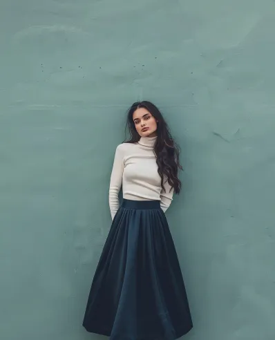 This outfit is the ultimate in modern elegance. A sleek black turtleneck is paired with a flowing white pleated midi skirt, creating a stunning monochrome look. The clean lines and timeless color combination are accented perfectly with classic black pointed-toe heels. The outfit is minimalist yet powerful, making it an excellent choice for a sophisticated winter tea party.