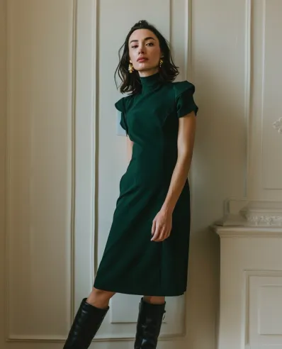 This emerald green fitted dress exudes sophistication with its structured design and subtle ruffle details on the shoulders. The high neckline and tailored silhouette create a sleek and polished look, while the knee-high black leather boots add an edgy, modern touch. Perfect for a winter tea party that calls for a chic, standout outfit.