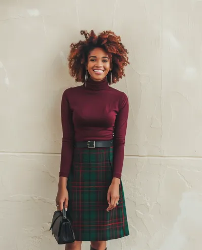 This outfit nails winter sophistication with a rich burgundy turtleneck paired perfectly with a high-waisted plaid skirt in classic green and red tones. The belt cinches the waist, adding structure to the silhouette, while sleek black knee-high boots and a petite black handbag round out the look with a polished, timeless vibe. It s a harmonious balance of cozy and chic ideal for sipping tea with friends in style.