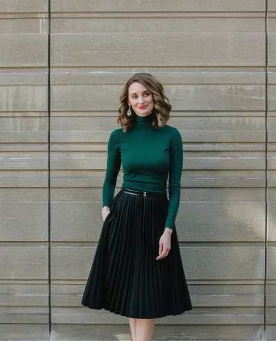 This outfit combines a rich emerald green turtleneck with a classic black pleated midi skirt for a look that s sleek and sophisticated. The belt at the waist adds definition, while the shiny black ankle boots bring a modern, edgy touch. It s a refined yet approachable choice for a winter tea party, exuding both confidence and elegance.