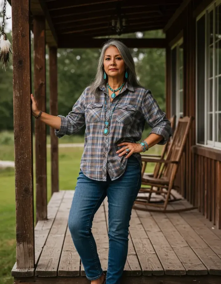 This outfit brings cozy country vibes with serious style. She s wearing a classic plaid button-up shirt in earthy tones, paired with fitted blue jeans that flatter her shape without looking too tight. Her moccasins are adorable with intricate turquoise detailing that ties in beautifully with her layered turquoise jewelry. From chunky necklaces to matching earrings and bracelets, it all gives the look a bold, artistic edge that still feels grounded and personal.