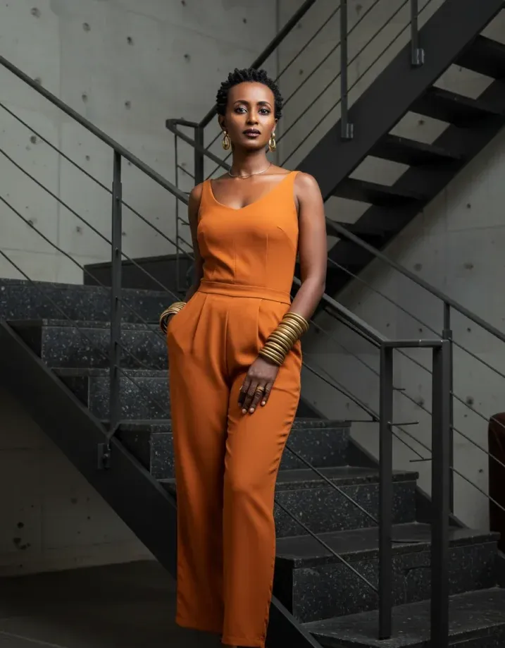 This bold and elegant outfit features a tailored burnt orange jumpsuit with a flattering sleeveless cut and sleek, tapered legs. The cinched waist creates a beautiful silhouette, while the minimalist neckline keeps it modern and refined. Paired with strappy neutral heels and stacked gold bangles, this look is both powerful and effortlessly stylish.