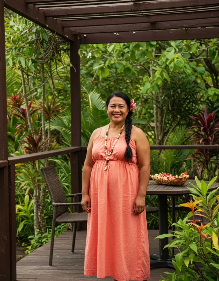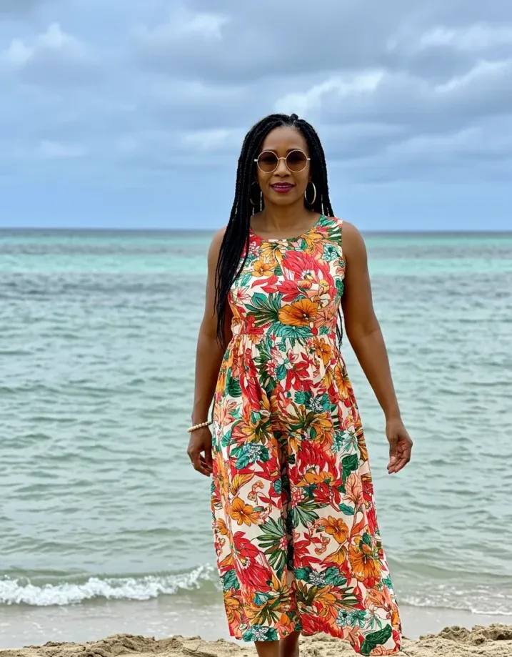 This outfit is tropical sunshine in dress form. She s wearing a coral-pink sleeveless maxi dress with a gathered neckline and a relaxed, flowing silhouette that s perfect for warm, breezy days. Shell jewelry adds natural texture and personality, while her sandals and braided hair give the whole look that easy island feel. The flower tucked behind her ear is the sweetest finishing touch.