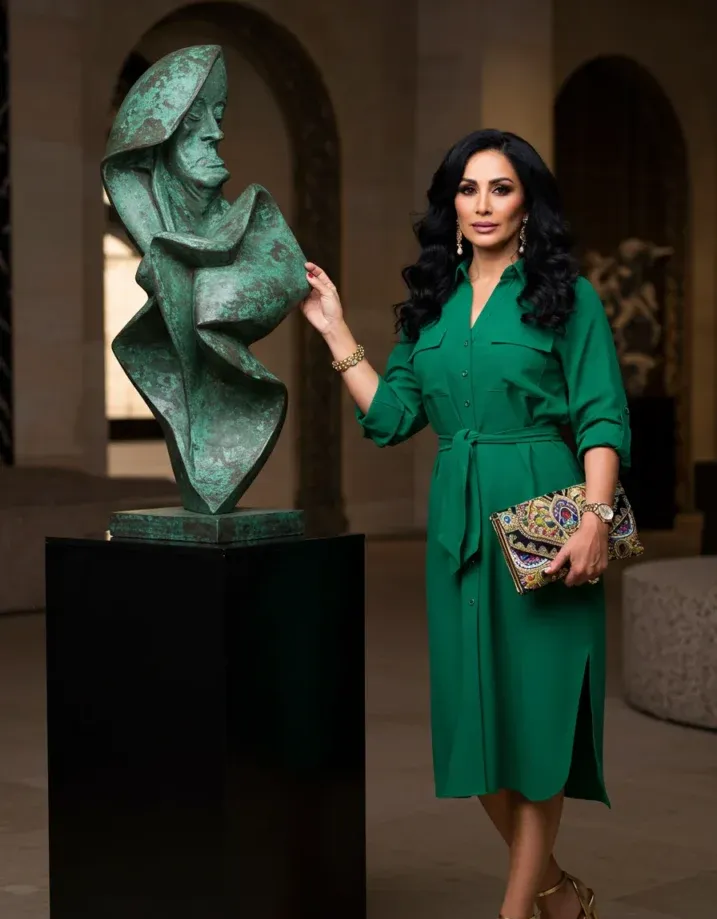 This outfit is pure confidence wrapped in emerald green. She s wearing a belted shirt dress that flatters with its tailored shape and polished finish. The rolled sleeves give it a relaxed touch, while the side slit adds a little flirt without going too far. Paired with strappy gold heels and an intricately beaded clutch, the look is museum-level elegant. Her gold jewelry and voluminous waves seal the deal with timeless glamour.