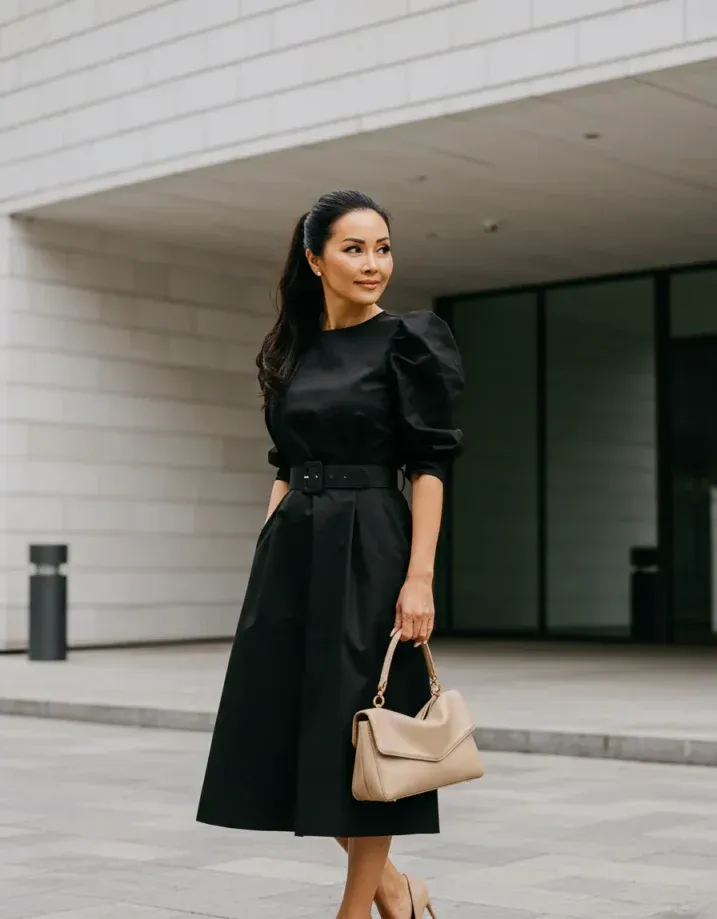 This outfit is a total showstopper. She s wearing a black midi dress with statement puff sleeves and a defined belted waist that gives it such a flattering silhouette. The fabric has structure but still flows beautifully, and the length is just right for both elegance and comfort. She pairs it with nude pointed heels and a chic beige handbag that adds contrast without stealing the spotlight. Her hair is pulled back in a sleek ponytail, and she finishes the look with pearl studs and soft makeup.