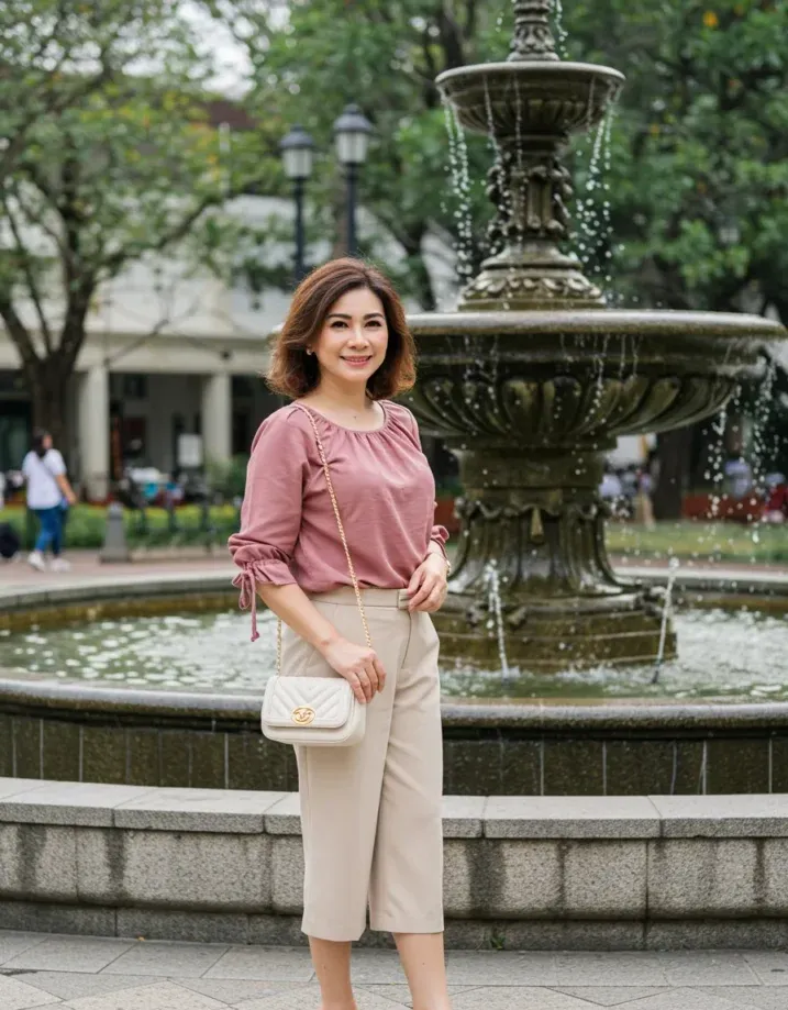 This outfit is all about soft tones and elegant simplicity. She s wearing a dusty rose blouse with gathered sleeves and tie accents that add just the right amount of charm. Paired with cream culotte trousers and white heeled mules, the look feels breezy yet polished. A quilted ivory handbag with a gold chain pulls it all together for a sweet and put-together finish.