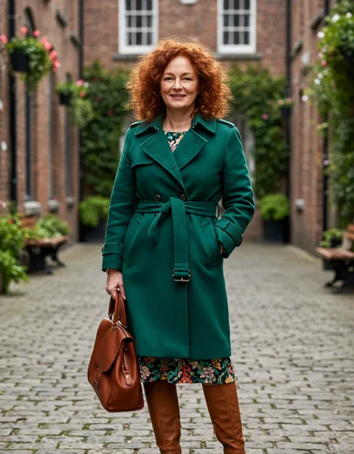 I m honestly obsessed with this color combo. Jewel tones always feel so luxe, and that green coat is such a statement piece. I love how it pairs with the floral dress and boots without clashing or looking overdone. This is the kind of outfit I d wear on a crisp fall day when I want to turn heads but still feel comfortable. It s bold, beautiful, and totally timeless.