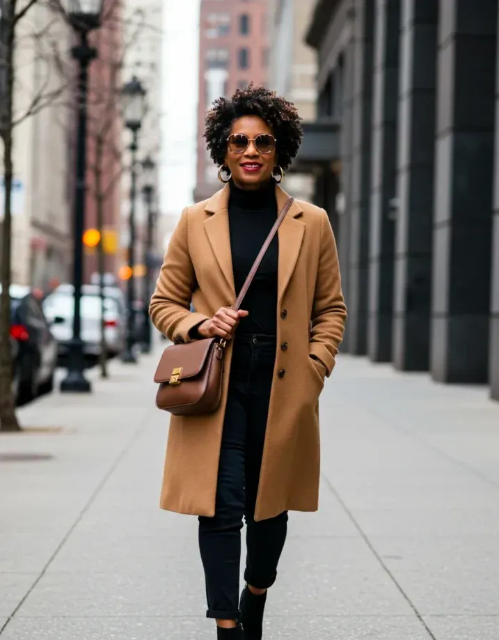 I seriously adore this look because it makes me feel like I run the city, even if I m just headed to grab coffee. The camel coat is such a must-have staple, and paired with the black-on-black base, it looks effortlessly cool. It s sharp, unfussy, and totally chic without trying too hard exactly how I want to feel walking into any room.