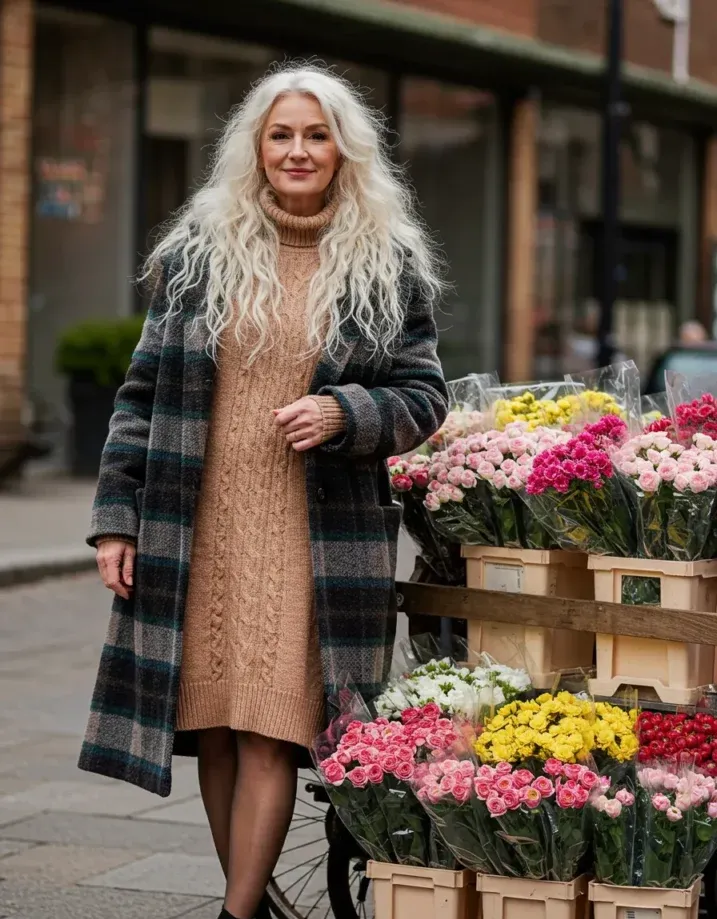 This outfit is like a warm hug wrapped in timeless style. She s layered a chunky camel-colored cable knit sweater dress under a long plaid coat in earthy tones of grey, green, and black. The textures mix beautifully, creating depth and softness all at once. Her black ankle boots keep it simple and grounded, letting the cozy statement pieces do the talking. That flowing silver hair just adds to the magical vibe.