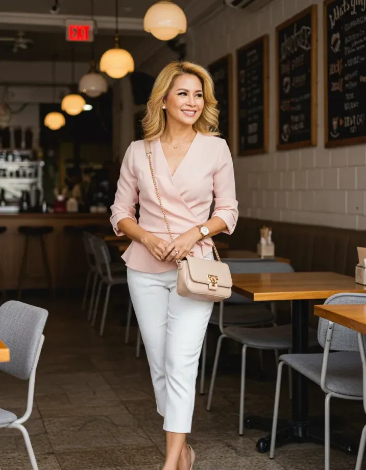 This outfit is soft sophistication at its finest. She s styled a blush pink wrap blouse with tailored three-quarter sleeves and a flattering peplum shape that cinches the waist just right. Paired with crisp white cropped pants and nude pointed heels, it creates a sleek silhouette that still feels gentle and welcoming. The gold-accented blush handbag, classic wristwatch, and dainty necklace finish the look with just the right amount of elegance.