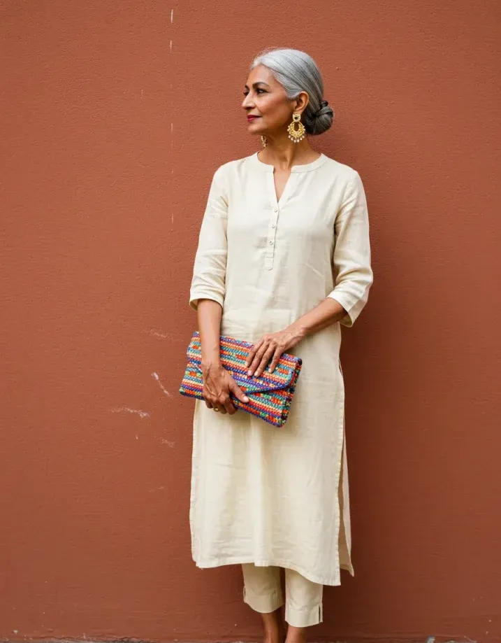 I absolutely love how this outfit balances calm elegance with just enough personality. The neutral tones are so chic and easy to wear, but that colorful clutch? Total game-changer. It’s like the outfit whispers sophistication and then suddenly shouts, Let s have some fun!â This is one of those looks that makes you feel polished without trying too hard, which is honestly the dream at any age.