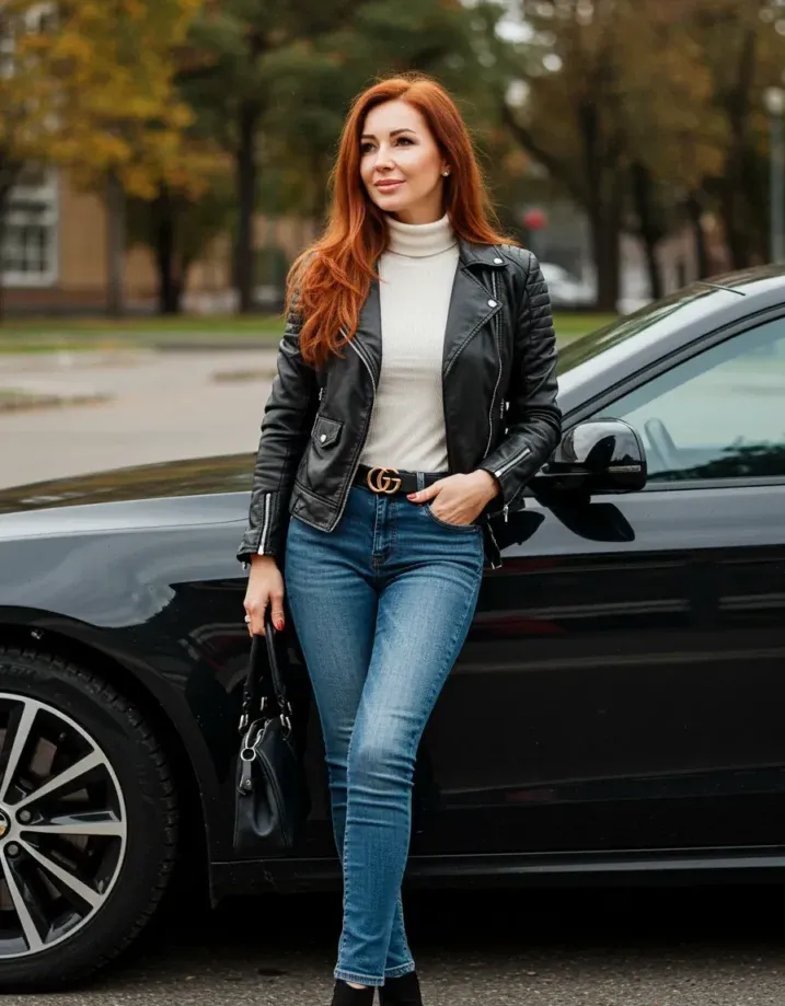 This outfit is a sleek mix of timeless and bold. She s styled a cream ribbed turtleneck with a structured black leather moto jacket that adds instant edge. Her medium-wash skinny jeans keep it laid-back and flattering, while a black designer belt pulls the look together perfectly. Black ankle boots and a matching handbag give it that cool city vibe without feeling too dressed up.