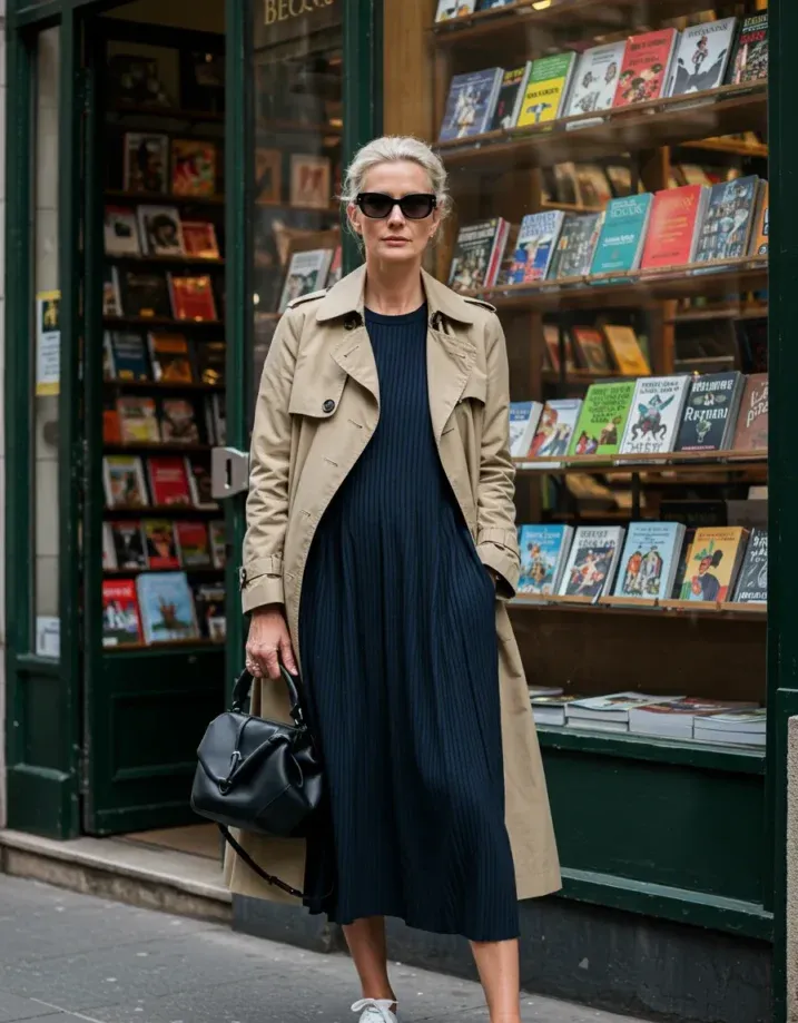 I honestly can t get enough of this look. It gives city-sophisticated without being the least bit fussy. The trench and pleats combo feels like that magical blend of timeless and fresh, and those sneakers? Absolute lifesavers for your feet and still totally on trend. This is the kind of outfit I d wear on a bookstore stroll that somehow turns into lunch and maybe a spontaneous gallery visit. Effortless but put-together, which is honestly my love language.
