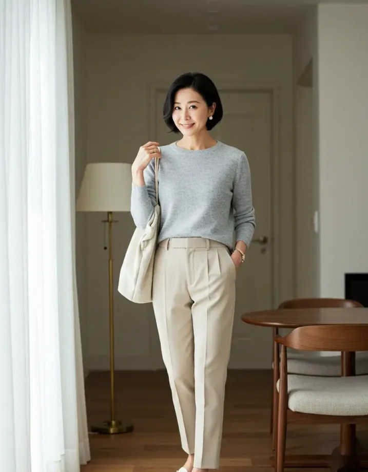 This outfit is the definition of chic minimalism. She s wearing a soft grey knit sweater that s slightly cropped and fitted just right, paired with tailored high-waisted beige trousers that taper at the ankle. A matching pair of ivory loafers keeps things polished and practical, while her simple shoulder bag in a similar tone blends in seamlessly. The pearl earrings and natural makeup give it all a graceful, refined finish.
