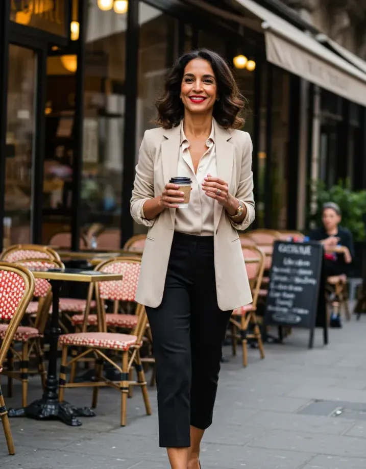 This outfit is a masterclass in modern chic. She s paired a silky champagne blouse with cropped black trousers and topped it off with a tailored beige blazer that gives the whole look an effortless polish. Black pointed heels add elegance, and her minimal jewelry keeps the vibe sleek and refined. That coffee cup and bold red lipstick? Chef s kiss. It s giving confident woman on the move.
