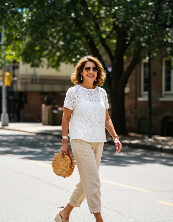 This outfit is sunshine in clothing form. She s wearing a white eyelet short-sleeve top that s full of delicate texture and airiness, paired with light beige cropped trousers that are cuffed just right for a laid-back feel. Her accessories tie it all together perfectly a pair of woven wedge sandals for some comfy height, gold earrings, a straw circle bag that s pure summer charm, and classic aviator sunglasses to keep it cool.