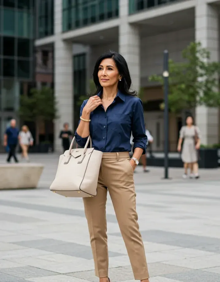 This outfit is crisp, confident, and ready to get things done. She s wearing a navy button-up shirt tucked neatly into slim-cut camel trousers that hit just above the ankle. Nude pointed heels elongate the legs, and her structured ivory tote adds the perfect touch of polish. A simple bracelet and watch keep the accessories elegant but minimal, letting the outfit speak for itself.