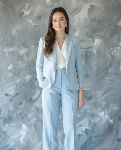 This tailored suit in a dreamy powder blue is both sleek and sophisticated. The structured blazer features subtle detailing and a fitted silhouette, perfectly complemented by matching high-waisted trousers. A tucked-in white wrap blouse adds softness and contrast to the ensemble. Paired with white pointed-toe heels and delicate earrings, this look exudes modern elegance.