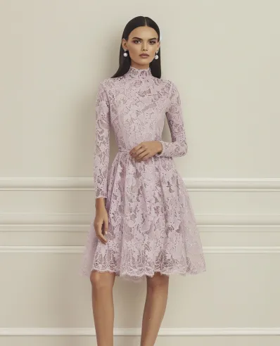 Lilac Lace Dress With a High Neck and Long Sleeves