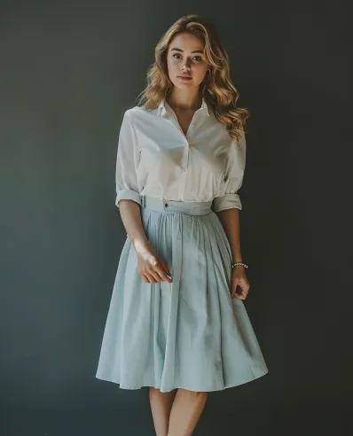 This charming outfit pairs a crisp white button-up blouse with a high-waisted pastel blue skirt. The blouse s relaxed fit and rolled-up sleeves add a casual yet polished touch. Meanwhile, the softly pleated skirt falls to just below the knees, giving off a classic, feminine vibe. Simple nude heels and delicate accessories complete the look, keeping it elegant and versatile.