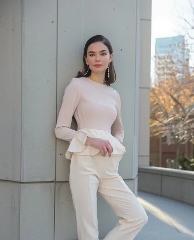 This outfit offers a modern twist on elegance with a soft blush long-sleeved peplum top and tailored white trousers. The top’s fitted bodice flares gently at the waist, creating a flattering peplum silhouette. The trousers feature a sleek, straight-leg design that elongates the figure, while nude heels and subtle drop earrings complete the polished look.