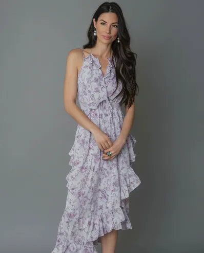 This feminine maxi dress in soft lavender features a delicate floral pattern and cascading ruffle details. The sleeveless design has a subtle V-neckline and a flattering waist tie, creating a flowy silhouette perfect for spring. The asymmetrical hemline adds a whimsical touch, while neutral heels and simple jewelry keep the look effortlessly balanced.