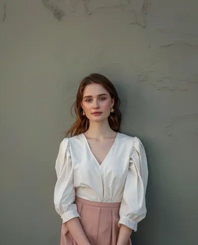 This outfit is the perfect blend of simplicity and elegance. The blouse features a flattering V-neckline with voluminous puff sleeves that add a touch of drama. It s tucked into a high-waisted pleated blush-pink skirt, which drapes softly to create a feminine and graceful silhouette. Paired with gold hoop earrings and dainty accessories, this look feels polished yet understated.