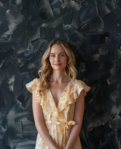 This delightful wrap dress is perfect for spring with its light yellow color and playful floral print. The V-neckline is framed by fluttery ruffle details that continue down the bodice, adding a soft and feminine touch. A tie belt at the waist enhances the silhouette, while the lightweight fabric creates a breezy, flowy feel. It’s effortlessly styled with loose waves and minimal jewelry for a fresh, cheerful look.