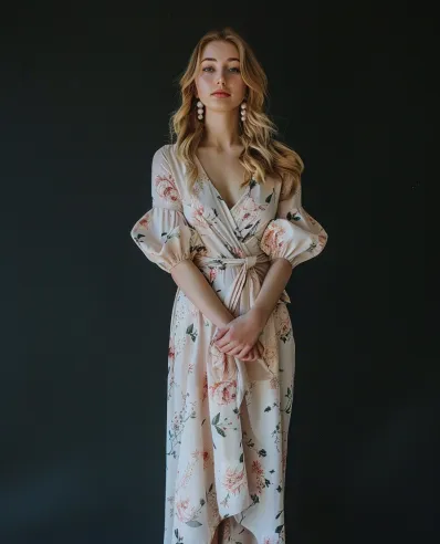 This outfit showcases a dreamy floral wrap dress in a soft, cream base with muted pink and green floral prints. The puff sleeves add a playful, vintage-inspired touch, while the wrap design accentuates the waistline with a tie belt. Its flowy fabric gracefully falls to a high-low hemline, creating a breezy and elegant silhouette. Paired with light green strappy heels and statement earrings, this look radiates effortless femininity.