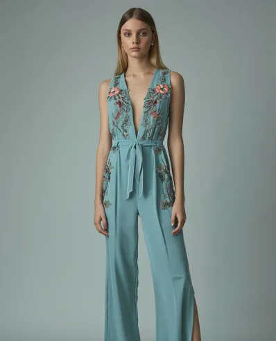 Embroidered Aqua Jumpsuit With a Plunging Neckline