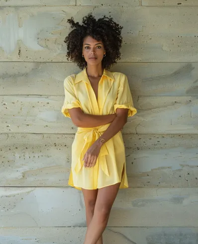 This playful yellow shirt dress is perfect for a casual yet stylish Easter look. Featuring a classic collared design with rolled short sleeves, it brings an effortlessly chic vibe. The tie waist adds shape and flatters the figure, while the mini length keeps things light and breezy. Paired with strappy nude sandals and delicate accessories, it s a bright and cheerful outfit for spring.