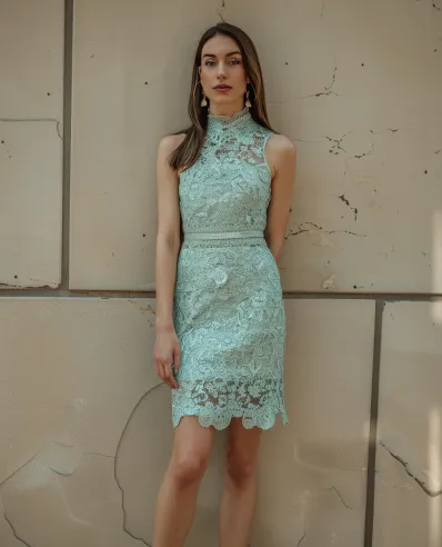 This lovely dress features a soft mint-green lace design, blending sophistication with a fresh, springtime vibe. The high neckline and sleeveless cut create an elegant silhouette, while intricate floral lace patterns add a delicate touch. The hemline falls just above the knees, with scalloped edges that subtly elevate the style. Paired with ivory block-heel sandals and minimalist accessories, the outfit exudes timeless charm.