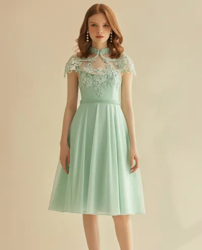 This ethereal mint chiffon dress exudes elegance and charm. The fitted bodice is enhanced by a delicate lace capelet that gently drapes over the shoulders, creating a romantic and graceful look. The skirt flares out at knee length, offering a soft, flowing silhouette. Paired with white open-toe heels and sparkling earrings, this outfit is sophisticated yet playful perfect for a springtime event.