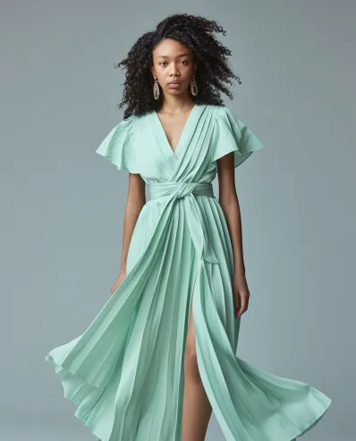 This stunning mint green wrap dress is both elegant and dynamic. The flutter sleeves and deep V-neckline give it a soft, feminine feel, while the flowing pleated fabric creates beautiful movement. A waist tie emphasizes the silhouette, and a high slit adds just a touch of drama. Paired with strappy sandals and statement earrings, this outfit is perfect for a spring celebration.