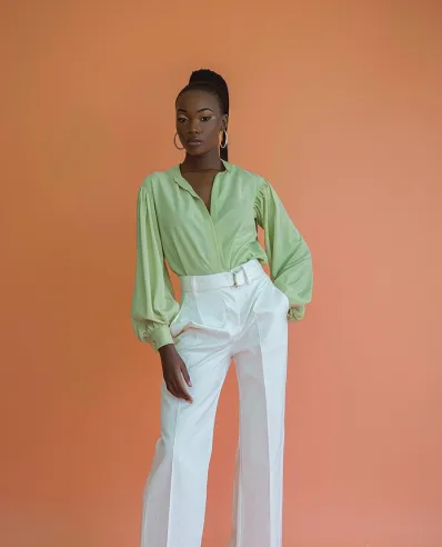 This outfit is a bold and refreshing statement for spring. The lime green blouse has a relaxed fit with a sharp collar and billowy long sleeves that gather at the cuffs, adding both structure and movement. It s tucked neatly into high-waisted, wide-leg white trousers, which give a crisp and tailored balance to the look. Metallic heels and gold hoop earrings bring in just the right amount of shine to complete the ensemble.