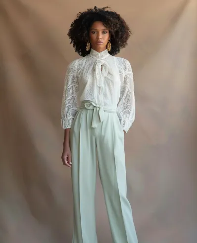 This outfit is a fabulous mix of feminine and tailored styles. The lace blouse features intricate patterns, sheer sleeves, and a chic bow tie at the neckline, adding elegance with a hint of vintage charm. It s paired with high-waisted mint-green trousers that have a tie belt for added structure and softness. Metallic heels and statement earrings pull the entire look together, creating a polished and sophisticated ensemble.