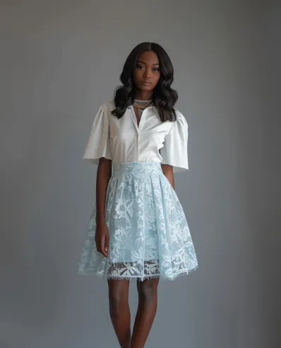 I love how this outfit mixes classic and modern elements! The structured blouse gives a fresh, tailored feel, while the lace skirt keeps things soft and feminine. The pastel blue is so on point for spring, adding just the right pop of color. It s perfect for a day full of activities you ll look classy without feeling overdressed. This is one of those ensembles that strikes the perfect balance between fun and elegance!