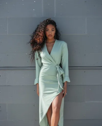 This sleek mint-green wrap dress features a deep V-neckline and long sleeves with soft, cuffed details. The side-tie wrap accentuates the waist, creating a flattering silhouette, while the asymmetrical hemline adds a modern and stylish edge. Paired with strappy white heels, the dress balances elegance and sophistication with a hint of boldness.