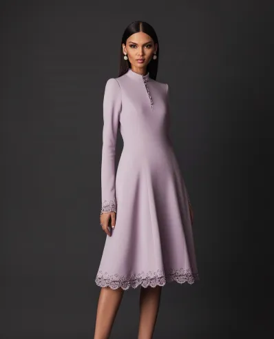 This sophisticated lavender dress is all about refined elegance. The high neckline and long sleeves give it a modest, polished look, while delicate lace trim at the hem and cuffs adds a feminine touch. The slightly flared skirt falls just below the knees, creating a graceful silhouette. Styled with cream ankle-strap heels and pearl earrings, this outfit is effortlessly chic.