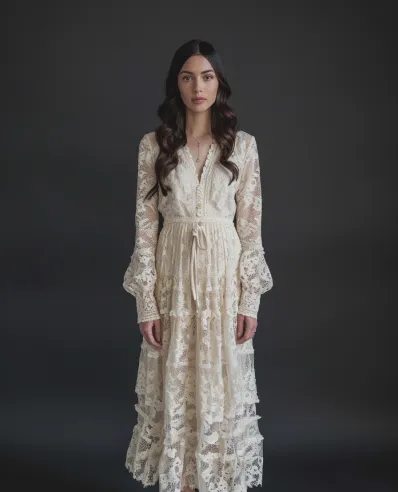 This romantic ivory maxi dress is a lace lover s dream. It features a deep V-neckline with delicate button detailing down the bodice and full-length lace sleeves. The tiered skirt flows beautifully, giving the dress an ethereal, vintage-inspired charm. A cinched waist tie creates a flattering silhouette, while nude flats add a touch of understated elegance for a comfortable finish.