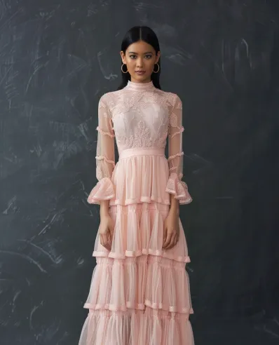 This breathtaking blush pink dress is pure elegance. The fitted bodice features intricate lace detailing with a high neckline and sheer long sleeves that flare slightly at the wrists. The tiered skirt is made of layers of soft tulle, creating a flowing, romantic silhouette. Paired with minimalist heels and gold hoop earrings, the outfit has a regal yet dreamy charm perfect for special occasions.
