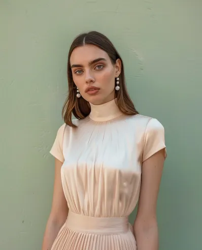 This elegant dress in soft champagne satin is all about understated sophistication. The high neckline and cap sleeves provide a refined touch, while gentle pleats on the bodice and skirt add structure and movement. The waistband emphasizes the silhouette, creating a flattering, feminine shape. Paired with pearl drop earrings, the look exudes a quiet luxury that s perfect for a special occasion like Easter.