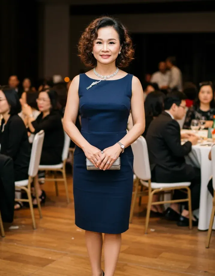 This elegant party look features a tailored navy sheath dress with a sleeveless cut and a flattering knee-length hem. The clean lines give it a timeless silhouette, and it’s beautifully styled with a silver brooch, a delicate diamond necklace, and a matching metallic clutch. The dark pumps keep it sleek and simple, letting the accessories bring just the right amount of sparkle.
