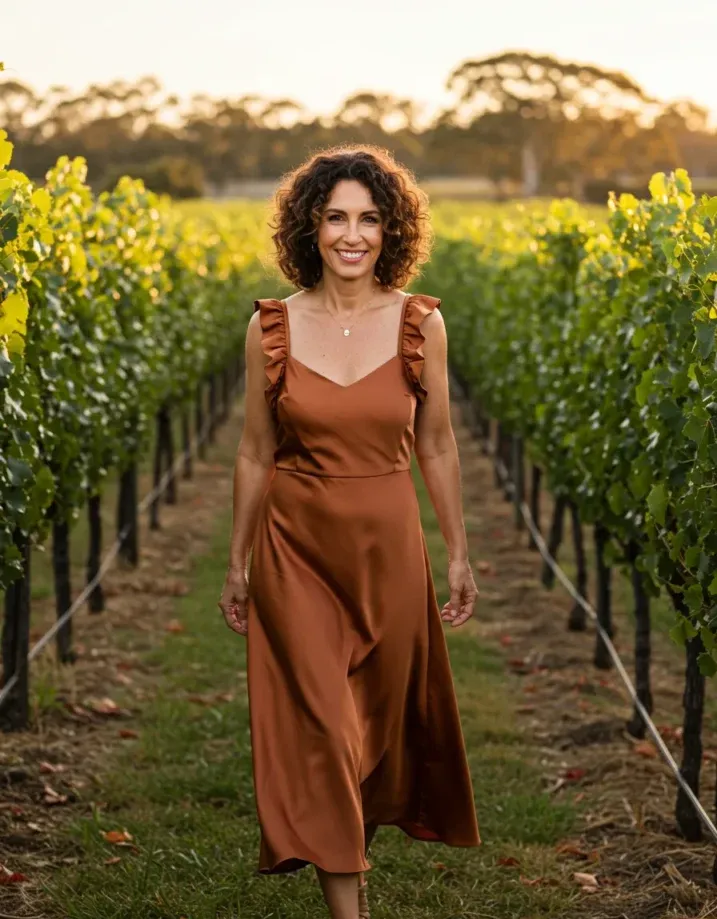 What I adore about this dress is how effortlessly beautiful it feels. The ruffle straps add a playful touch, and that warm rust tone is such a gorgeous choice especially for outdoor gatherings. It s comfy without looking casual, and it moves so gracefully. It s the kind of dress that makes you feel like you’re glowing from the inside out, even before the first glass of wine.