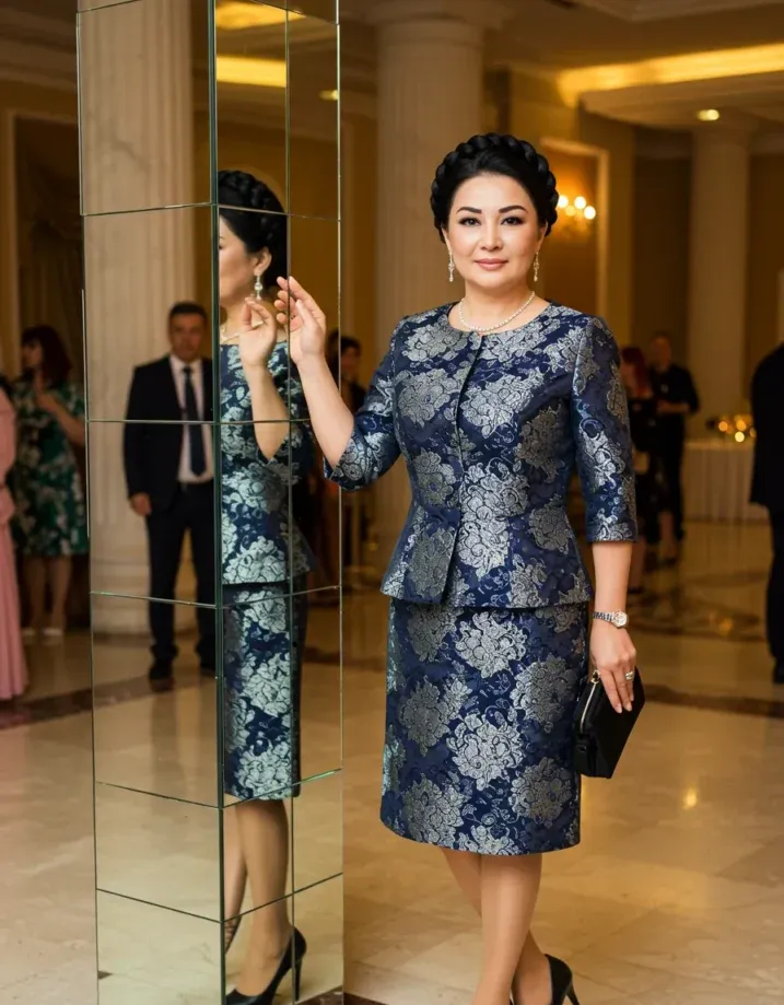 This timeless party outfit features a tailored navy blue brocade skirt suit with silver floral patterns woven into the fabric. The structured peplum jacket with three-quarter sleeves adds a flattering shape, while the knee-length skirt keeps the look balanced and sophisticated. Pearl earrings, a classic watch, and a small black clutch complete the ensemble with a graceful finish.