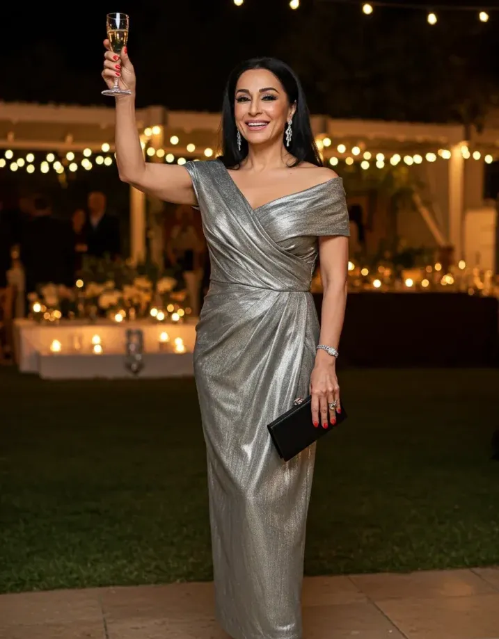 This glamorous party outfit features a shimmering silver off-shoulder gown with softly ruched draping across the bodice and waist. The fabric hugs the figure gracefully and flows into a floor-length hem that feels red-carpet ready. She accessorizes with sparkling chandelier earrings, a black clutch, nude heels, and a confident toast that totally steals the spotlight.