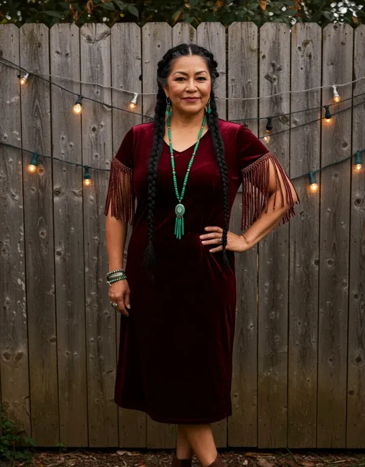 This unique party outfit features a rich burgundy velvet dress with short sleeves trimmed in playful fringe that sways as you move. The midi length keeps it grounded and elegant, while the earthy texture of the velvet makes it feel extra cozy and festive. She completes the look with brown suede ankle boots and striking turquoise jewelry that adds a bold and beautiful contrast.