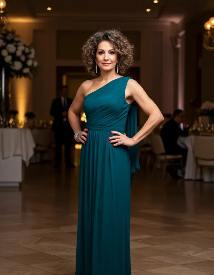 This elegant evening look features a floor-length teal gown with a flattering one-shoulder neckline and gentle pleats that wrap across the bodice. The soft fabric drapes beautifully and adds movement as you walk, while the fitted waist creates a graceful silhouette. Finished with silver heels, chandelier earrings, and a bold bracelet, it s a classic ensemble with a modern edge.