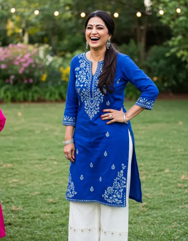 This cheerful party outfit brings together a rich royal blue kurta embroidered with delicate silver patterns, paired with wide-legged white palazzo pants featuring lace trim. The three-quarter sleeves and split sides add ease of movement, while the intricate threadwork gives it a lovely festive charm. She finishes the look with silver sandals, sparkly earrings, and bangles that tie everything together with effortless grace.